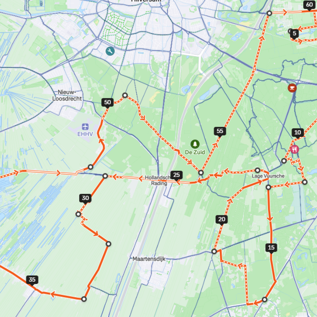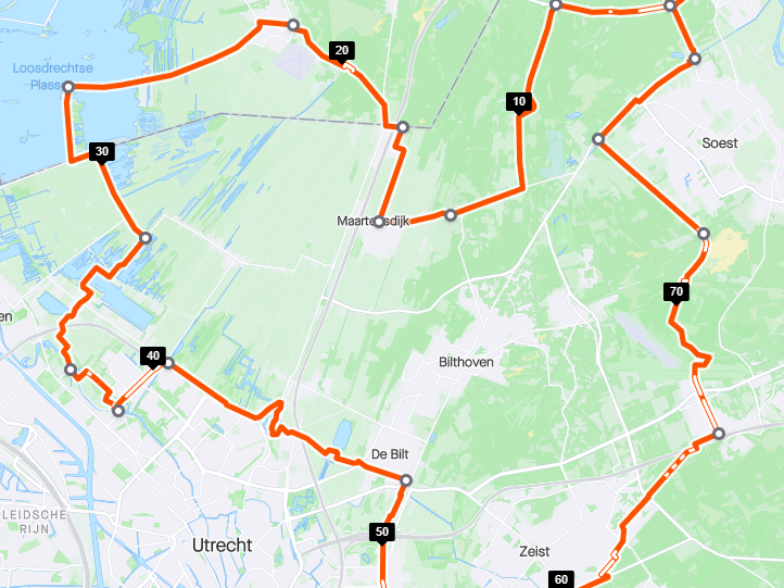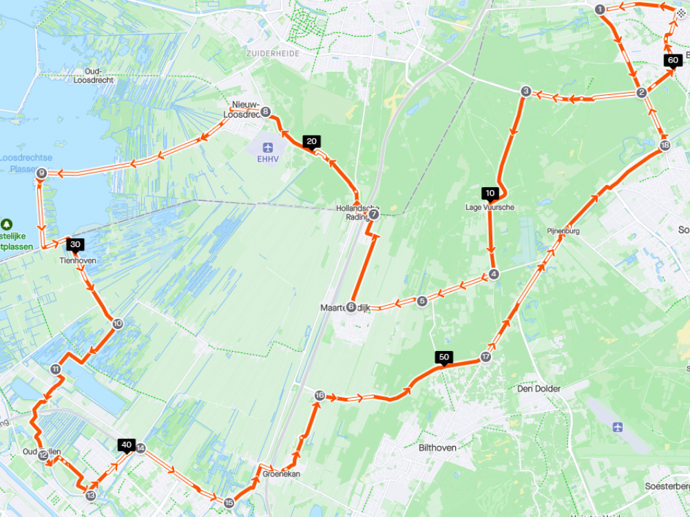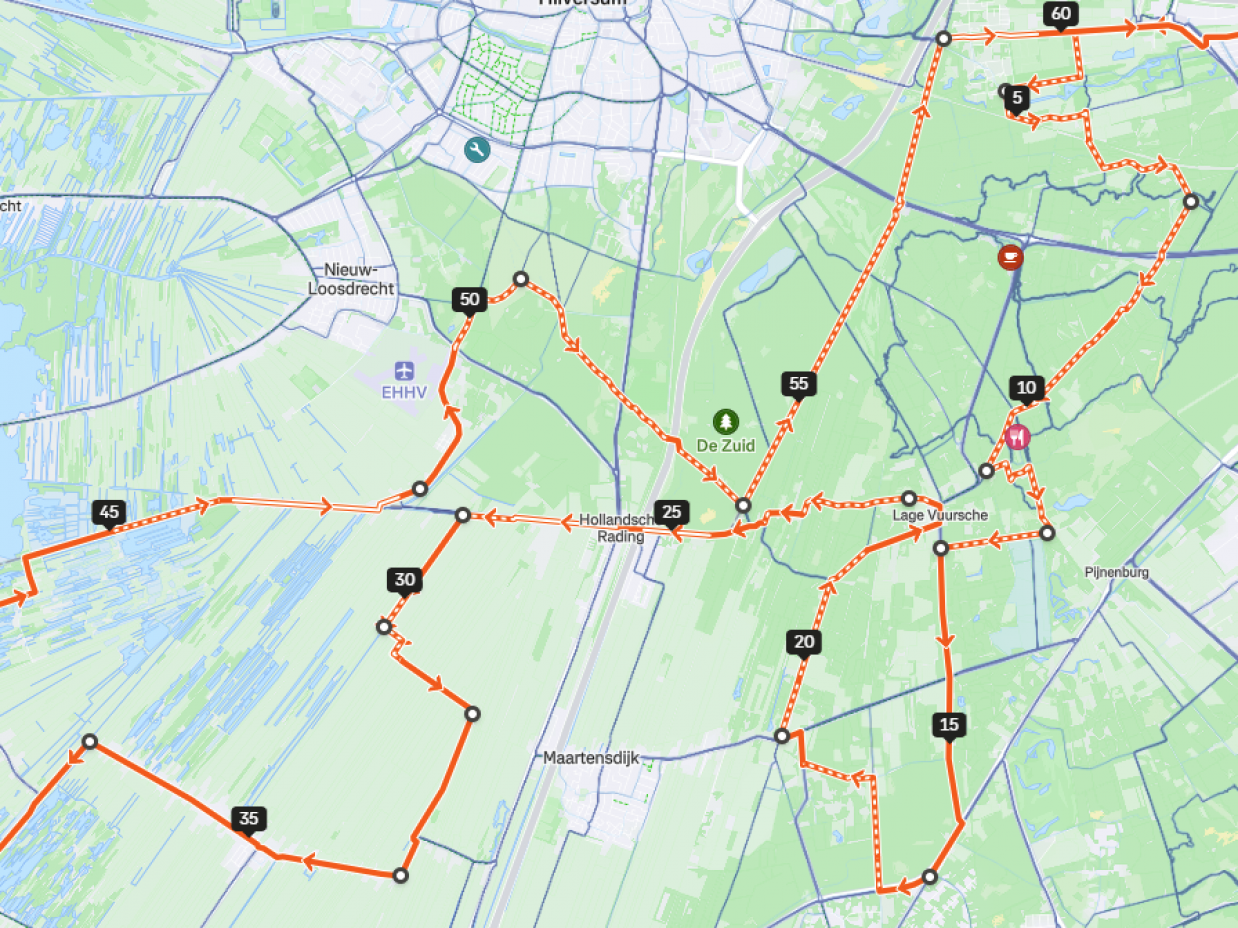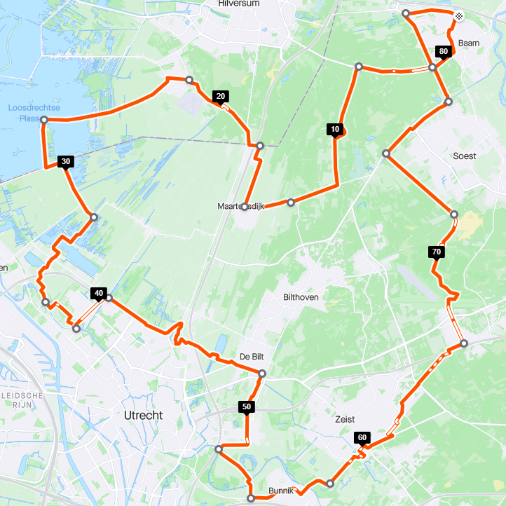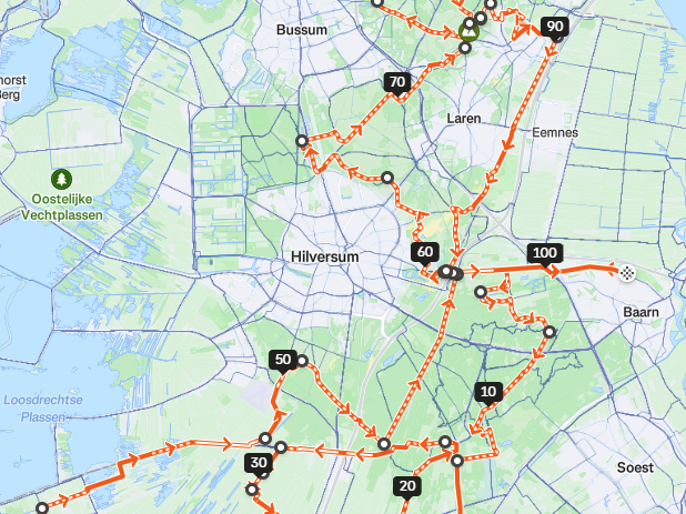 Vervolgens rijd je over de hei richting het Gooimeer met een schelpenpad langs het Gooimeer en een paar korte maar steile klimmetjes bij de Tafelberg. Via een lange gravelstrook en schelpenpaden fiets je terug richting start en finish in Baarn.