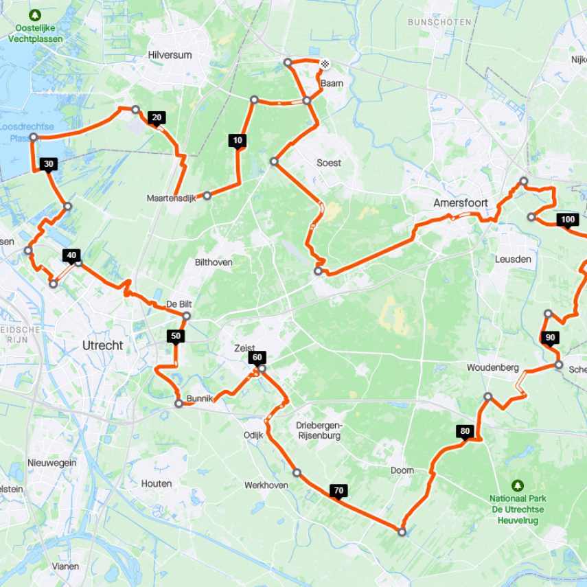 De route bestaat vooral uit schelpenpaden, brede grindstroken en rustige asfaltwegen. Je rijdt door de bossen bij Hoge en Lage Vuursche. Bij Tienhoven rijd je vooral over asfaltwegen (samen met de route van en naar start/finish zijn dit de enige asfaltwegen in de route).