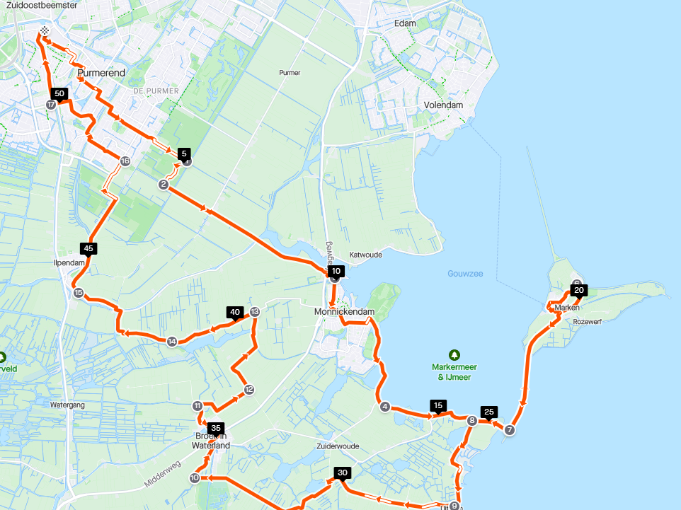 Vanaf het alom bekende Spijkerman in Purmerend rijden we via Oudendijk, Schardam en Etersheim (met het museum schooltje waar Johan C. Kieviet zijn Dik Trom verhalen schreef) naar de IJsselmeerdijk. Door het historische stadje Edam en Volendam via Monnickendam over de Zeedijk, met aan twee kanten water, naar de verzorgingspost op het schiereiland Marken. Hier kun je even uitwaaien en ervaar je de woelige geschiedenis van de eilandbewoners die hun huizen op palen bouwden om zich te verweren tegen het water.