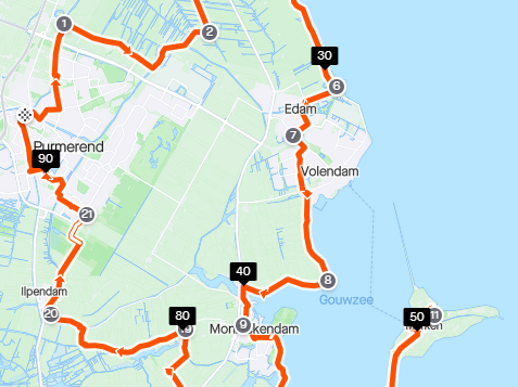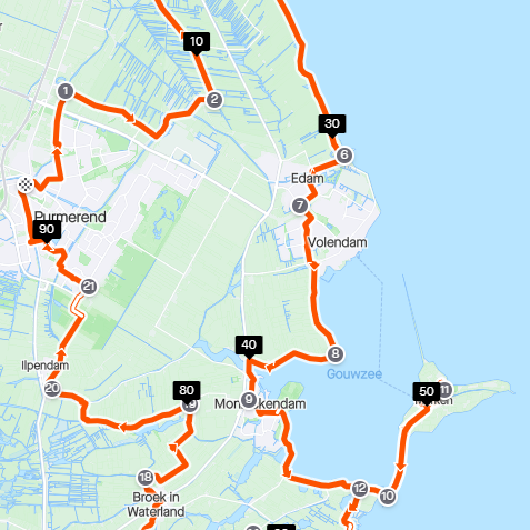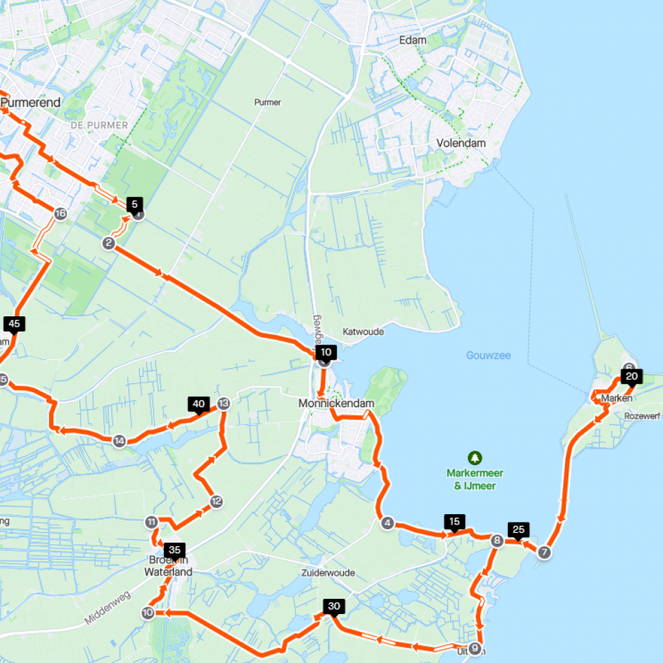 Na de stop fiets je terug naar het vasteland. Bovenop de Zeedijk heb je een groots uitzicht over het Markermeer. In Uitdam buigen we af naar het veenweidegebied boven Amsterdam waar het water soms hoger staat dan de slingerende weggetjes. Daarbij passeer je historische dorpjes als Ransdorp en Durgerdam. Na Durgerdam rijden we over de voormalige gifbelt Volgermeer, nu omgetoverd tot recreatiegebied, naar Broek in Waterland met zijn klassieke grijs geschilderde huizen. Na Ilpendam rijden we weer naar de finish in Purmerend. De afstanden zijn volledig uitgepijld. De GPX bestanden worden een week voor het evenement bekend gemaakt.