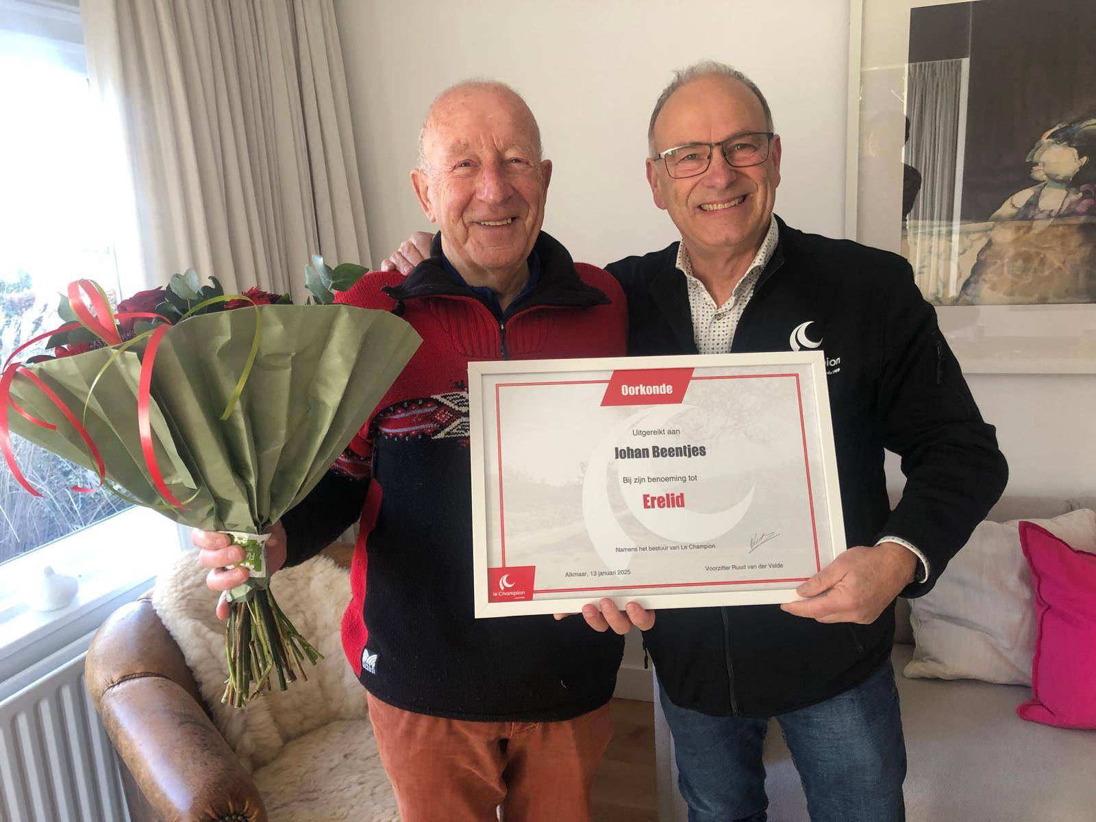 Johan werd in 2015 al benoemd tot Lid van Verdienste vanwege zijn jarenlange inzet als vrijwilliger. Hij is in 1978 lid van Le Champion en heeft sindsdien veel betekend voor de Egmond Halve Marathon, waarvoor hij al 35 jaar actief is. Sinds 2015 maakt Johan ook deel uit van de Wandelcommissie, waar hij routes uitzette en nieuwe wandelevenementen bedacht. Hij was mede-initiatiefnemer van onder andere de Fjoertoer Egmond, Amsterdam City Walk, Amsterdam Light Walk, Oer-IJ Expeditie en de Haarlem City Walk. Bij al deze evenementen is Johan zowel in de organisatie als de uitvoering actief. Vanwege zijn uitzonderlijke inzet is Johan benoemd tot erelid.
