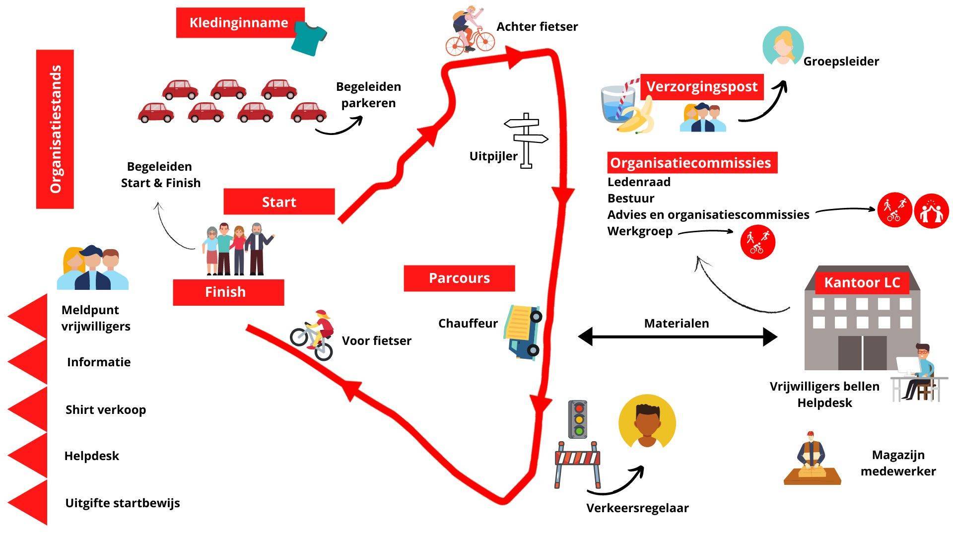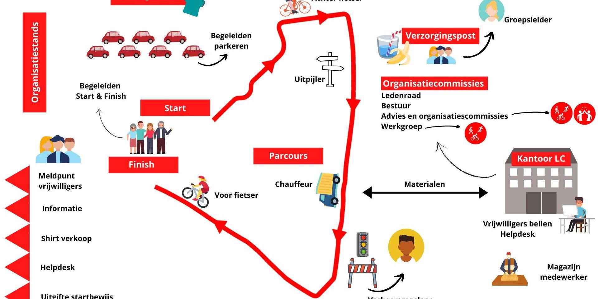Voor- of achterfietser Als voorfietser fiets je voor de eerste deelnemer uit en begeleid je deze over het hele parcours. Als achterfietser blijf je tot de finish bij de laatste deelnemer. Zo fiets jij zelf ook het hele parcours!